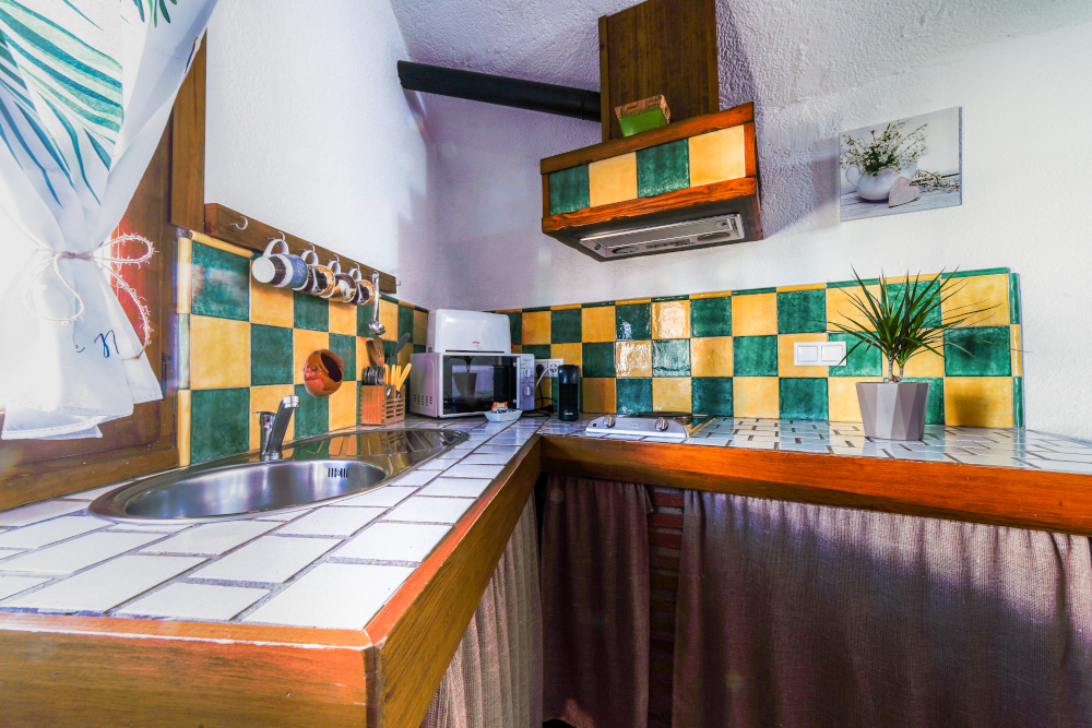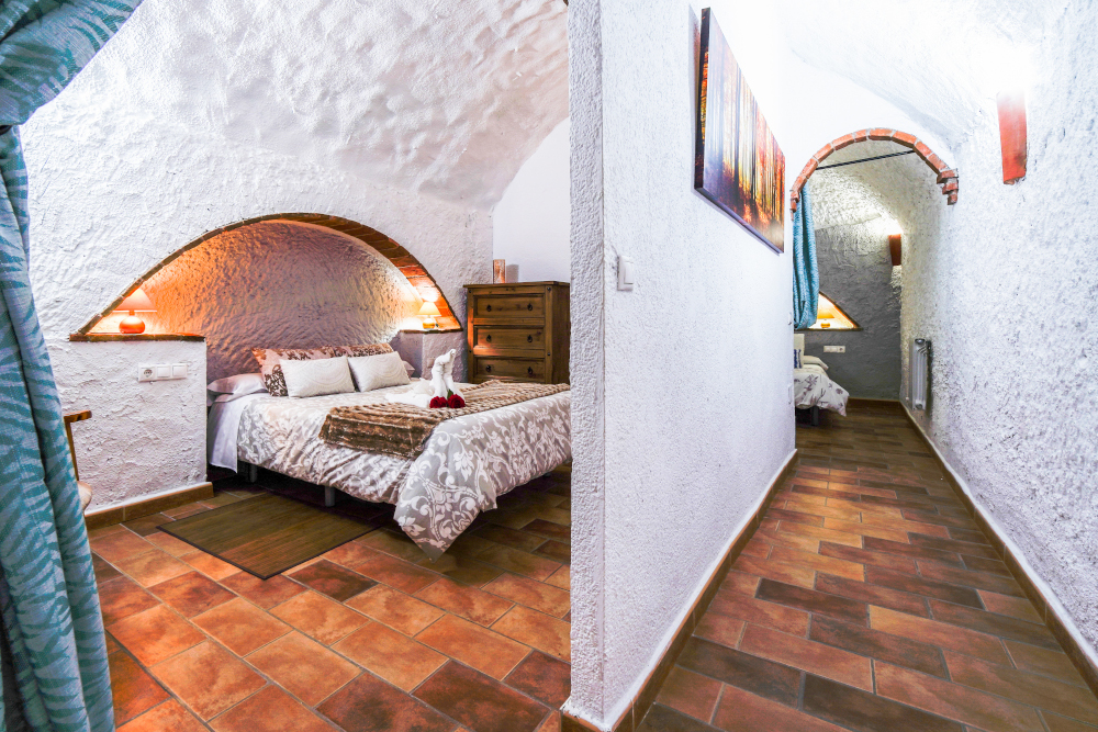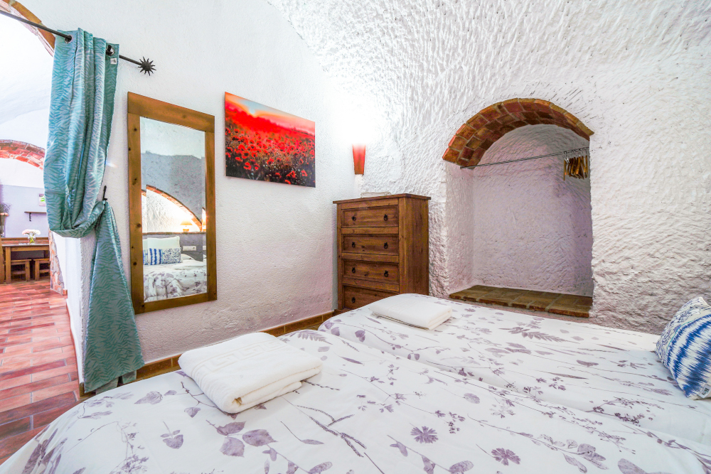 La cueva El Trillo de 2 dormitorios, se encuentra ubicada frente al jardín principal. Tiene una terraza con una mesa y 2 sillas de jardín. Dispone de cocina completa con microondas, frigorífico, batidora, tostadora, exprimidor, menaje completo para cocinar y servir. El salón-comedor dispone de sofá, televisión, mesa de comedor y sillas. Tiene un dormitorio con cama de matrimonio y otro con 2 camas individuales, ropa de cama, armario, cómoda y mantas. Dispone de baño completo, con juego de toallas, secador de pelo, gel, champú y jabón de manos.